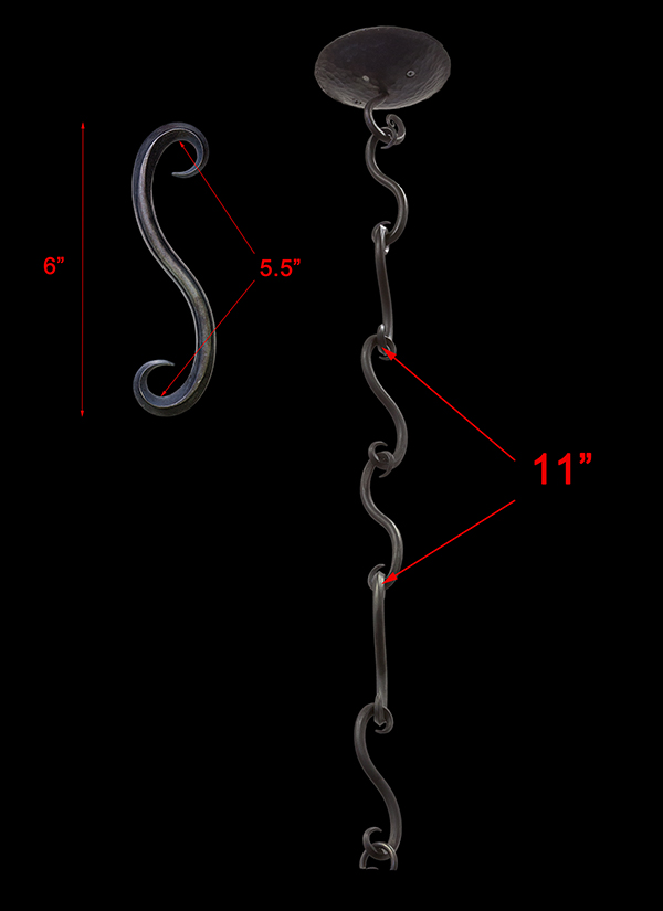 Hand forged iron pieces that are used with traditional ironwork or ceiling mounts, to extend the length between ceiling cap and hanging system.  The S-Hooks are approximately 6” long, however, when two are hooked together they measure approximately 11”.  S Hooks are not included in the hanging system.