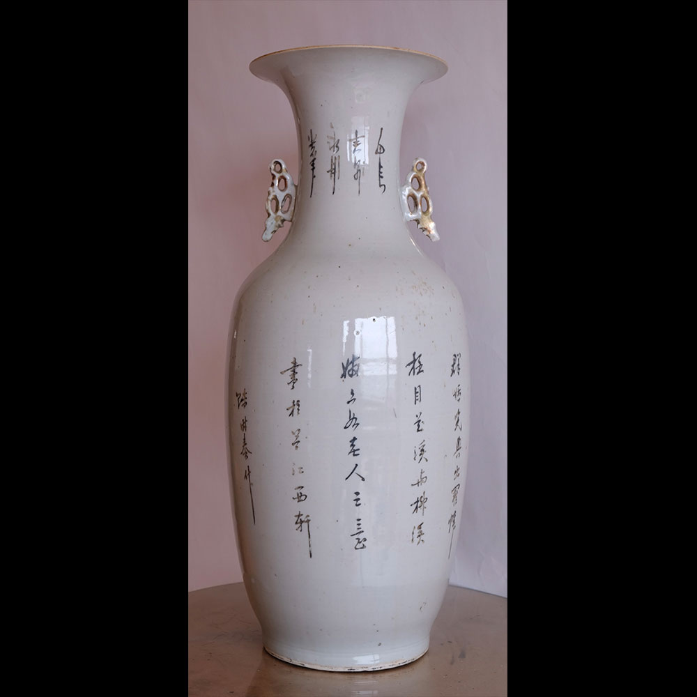The calligraphy refers to the “Three Friends of Winter” (pine, bamboo, and plum blossom) motif, which symbolizes steadfastness, perseverance, and resilience in East Asian art and culture. The three plants are associated with winter because the pine and bamboo remain green year-round, and the plum is among the first trees to flower in the spring. The vase is likely from the Republic Period (1912-1949).