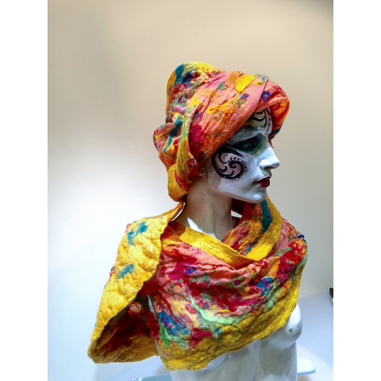 Fanciful, fun and practical; Ulla;s creativity has burst forth in one-of-a-kind wearables. Each is hand felted of fine wools and silk, renewable & sustainable resources. Be courageous and bring joy!